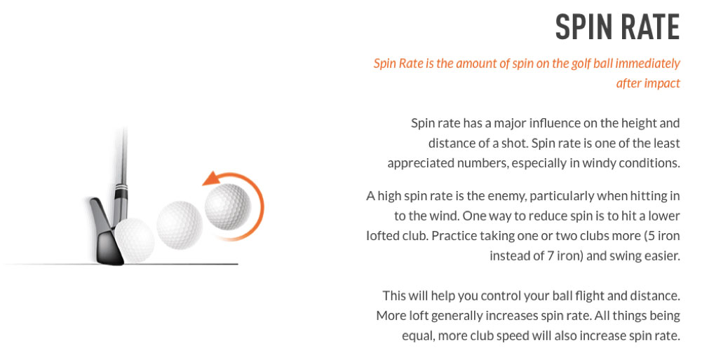 ROTAZIONI DELLA PALLA (SPIN RATE) Quanto la pallina gira in ogni colpo per minuto (RPM). Possiamo misurare la quantità di backspin sui colpi corti e sapere quanto ridurre questo effetto sul driver per una maggiore distanza.