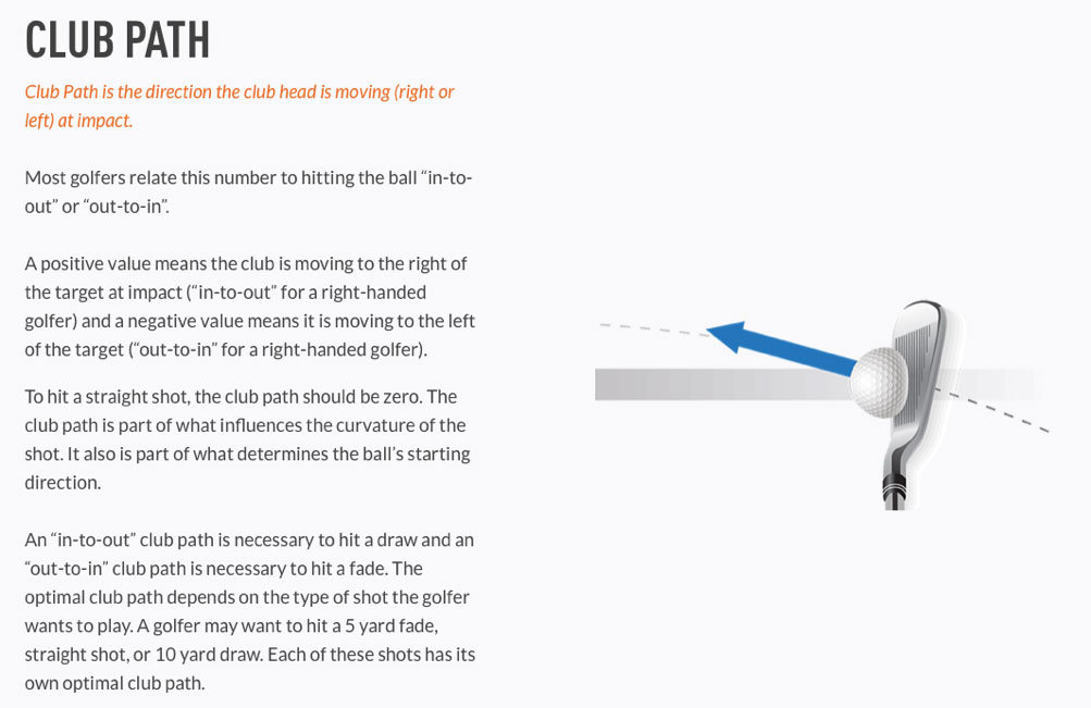 TRAIETTORIA DEL BASTONE (CLUB PATH) Traiettoria tridimensionale del centro di gravità della testa del bastone durante l’intervallo di tempo dell’impatto. E’ sempre un dato positivo, e indica quanto il nostro ferro guardava a destra del bersaglio.
