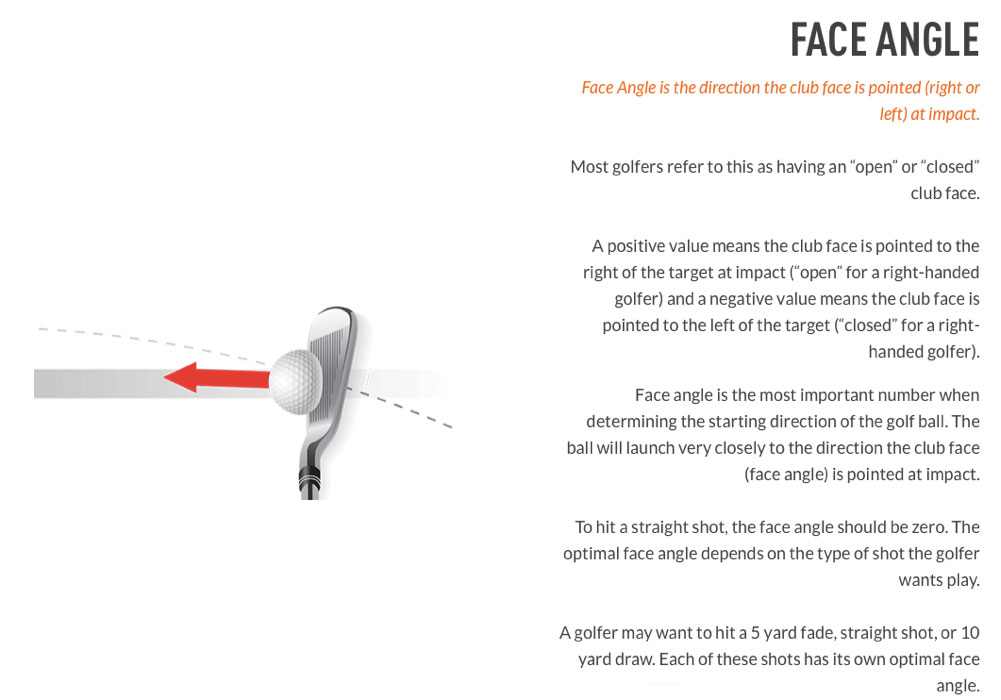 FACCIA DEL BASTONE (CLUB FACE) Posizione orizzontale della faccia del bastone rispetto il bersaglio nel punto di massima deformazione della palla da golf. Cioè dove guardava la faccia del bastone all’impatto, il dato positivo indica quanto a destra del bersaglio guardava la faccia del bastone.