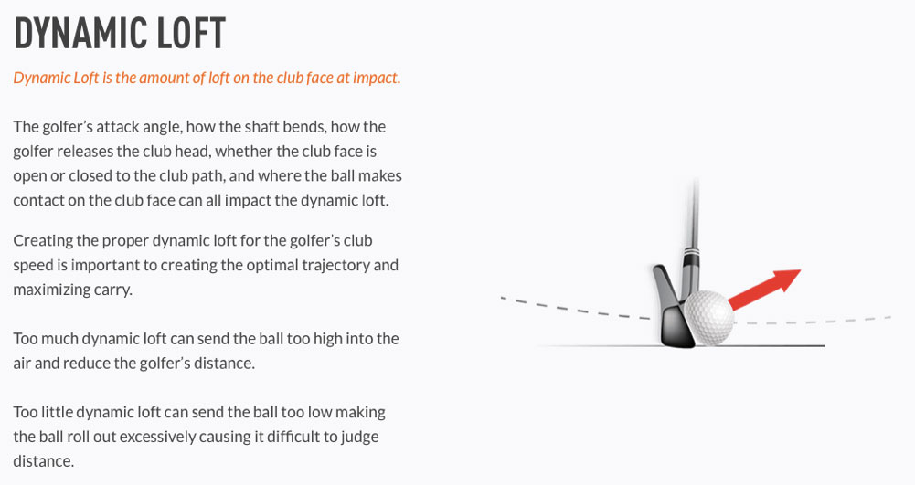 LOFT DINAMICO (DINAMIC LOFT) La quantità di loft del bastone (inclinazione) nel punto di massima deformazione della palla da golf. Questa è la quantità di loft che è direttamente responsabile del lancio e dello spin del colpo.