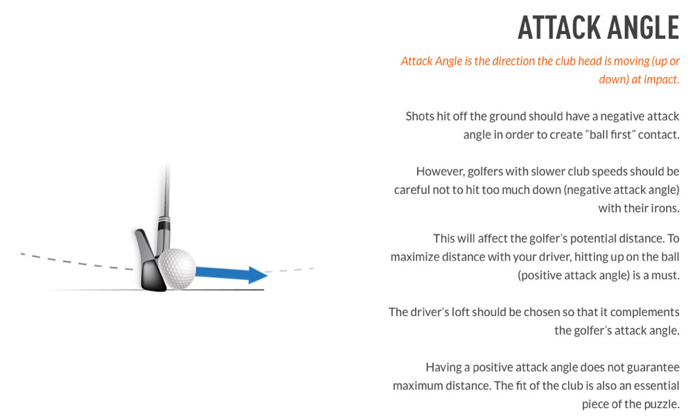 ANGOLO D’ATTACCO (ATTACK ANGLE) Dall’alto o verso il basso, la traiettoria del centro di gravità della testa del bastone durante l’intervallo di tempo dell’impatto. In caso di dato negativo significa che abbiamo colpito dall’alto verso il basso e viceversa in caso di dato positivo.